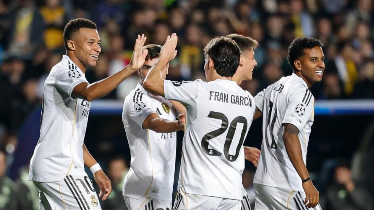 Pemain Real Madrid rayakan kemenangan atas Kairat di Liga Champions.